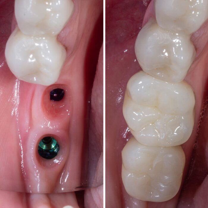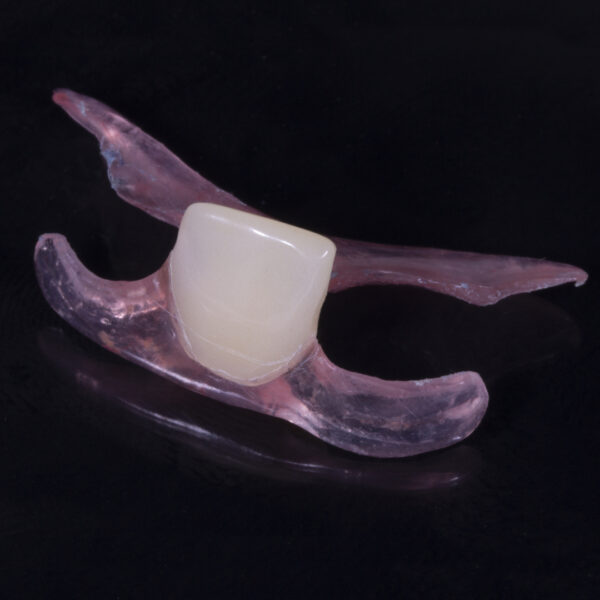 Изготовление временного, маленького (на один зуб) эстетичного протеза, который позволит выиграть время и полноценно подготовиться к дальнейшему восстановлению дефекта зубного ряда путём дентальной имплантации.