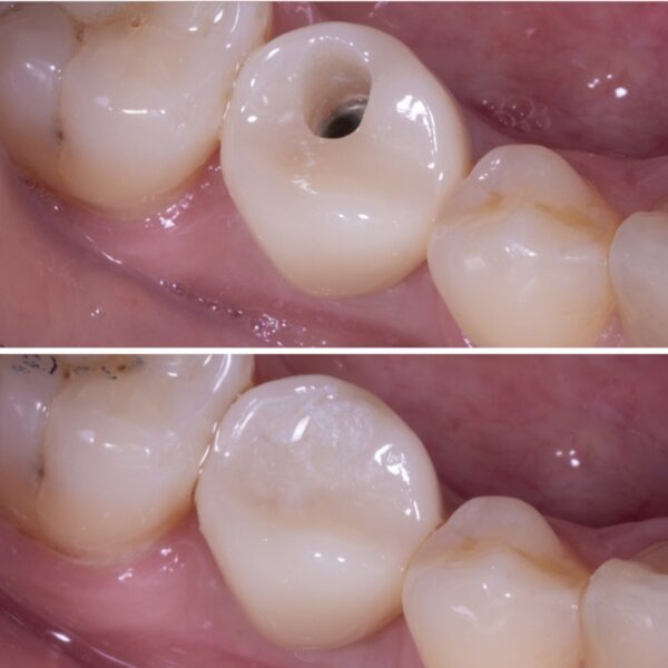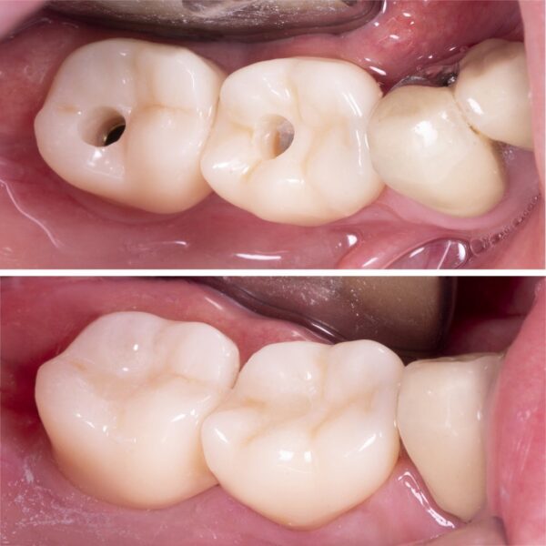 Установка одиночных восстановительных коронок E-max, с самым опаковым (непрозрачным) цветом внутреннего каркаса, который сумел справиться с дисколоритом и дать ожидаемый эстетический результат.