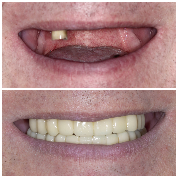 Удаление несостоятельных зубов; установка 6 имплантатов на верхнюю и 6 имплантатов на нижнюю челюсть по хирургическим шаблонам; установка временных протезов на верхнюю и нижнюю челюсть.