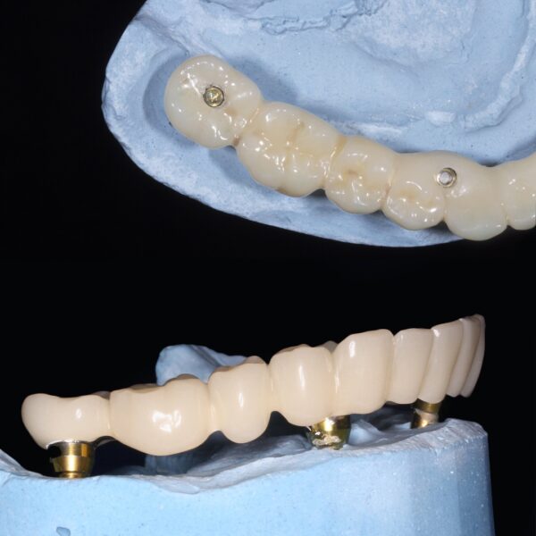 Удаление несостоятельных зубов; установка 4-х имплантатов на верхнюю и 4-х имплантатов на нижнюю челюсть по хирургическим шаблонам; установка временных протезов на верхнюю и нижнюю челюсть.